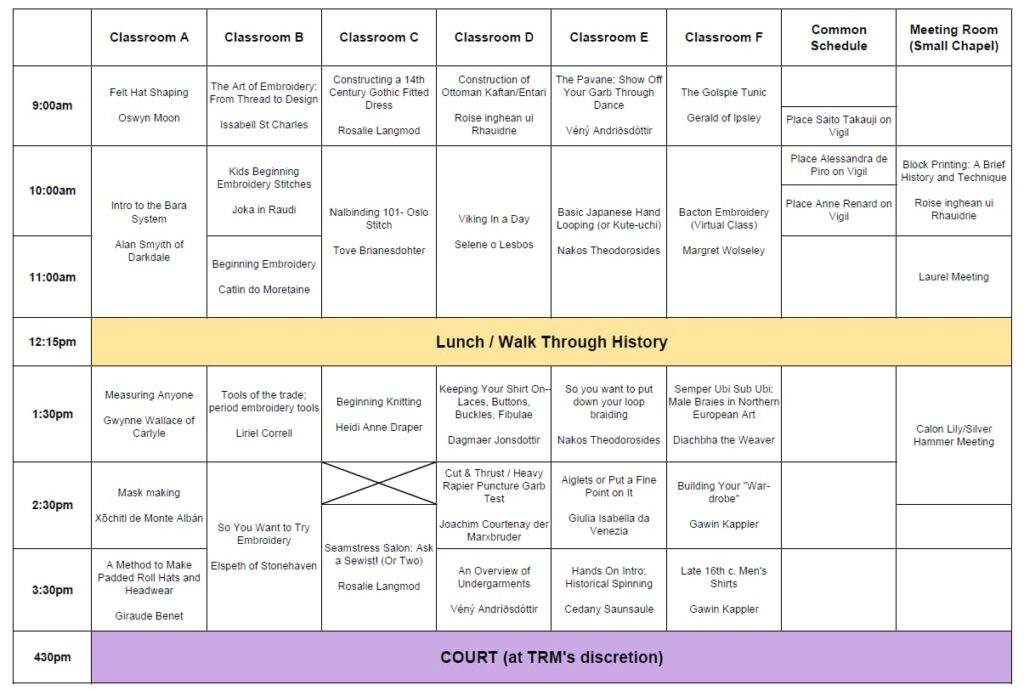 This seminar-style event is a day of classes that are all about how to create the clothing and accessories we wear. It is a great place to learn what garb you enjoy best, and how to make them. We will see many different garments from all of history at this event!